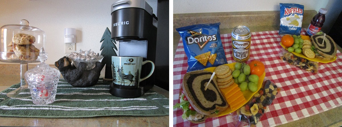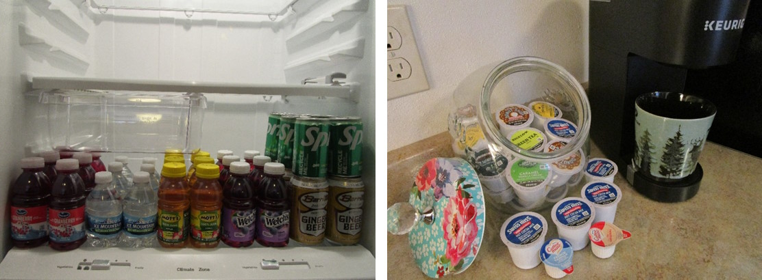 is open 24 hours a day and is stocked with bottled water, juices, sodas, coffee, specialty coffees, teas and hot chocolate. No need to be afraid of drinking cold fresh Well Water from our Tap Water on site. The Well is checked yearly to ensure the safety of the water. For your enjoyment the lounge contains a Keurig Machine, Coffee Machine, Electric Tea Kettle, Toaster, Small Microwave and mugs, glasses, glass plates and bowls and flatware. Just leave used dishes on the “provided tray” on the tray table behind the sofa and we will replace the tray and wash the dishes.