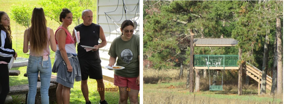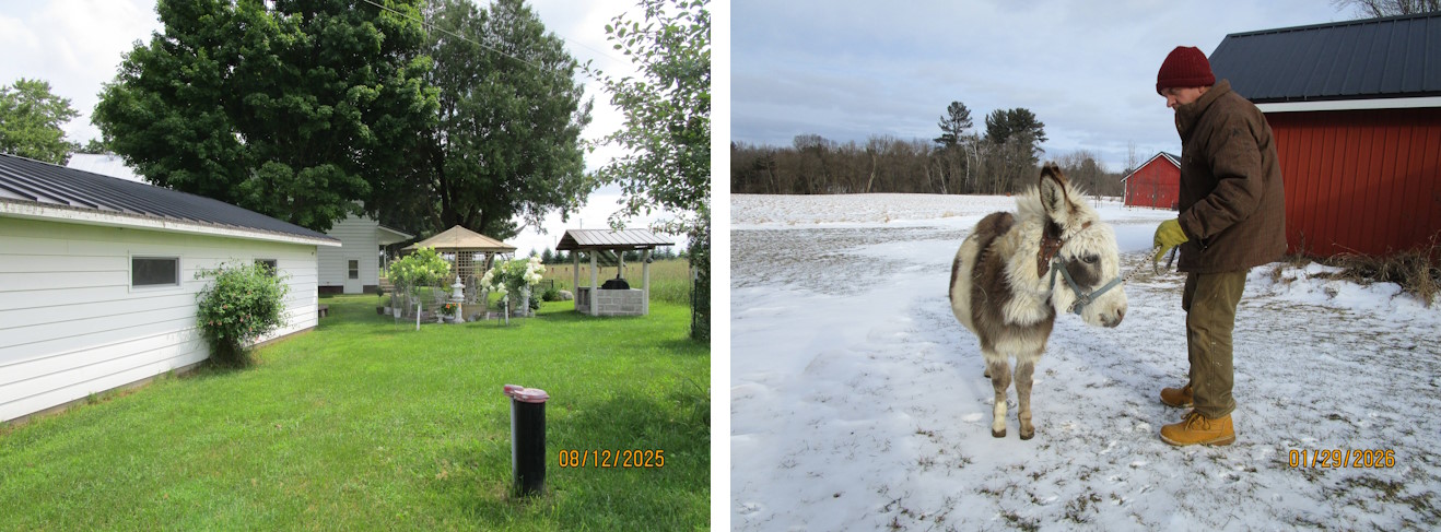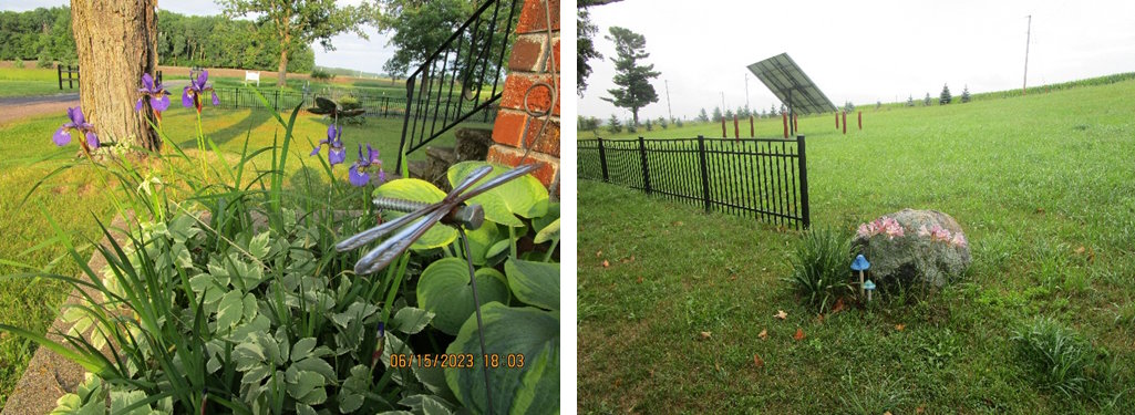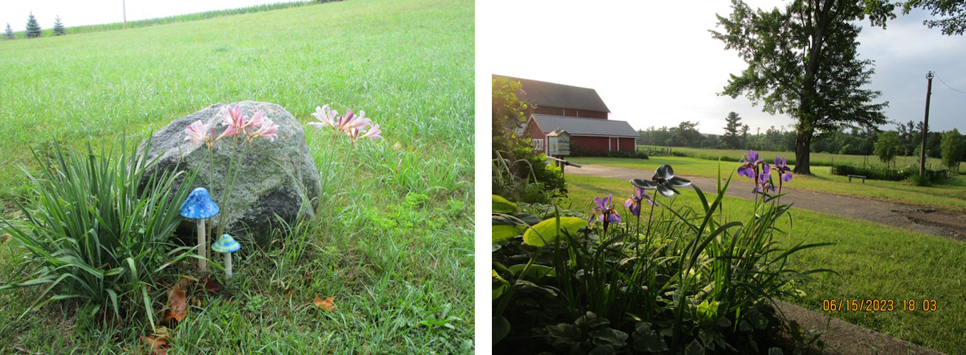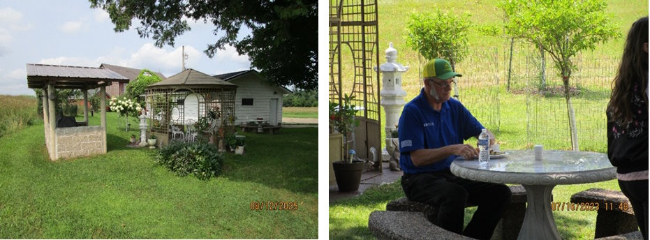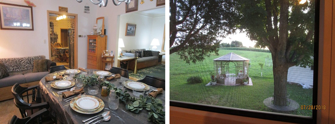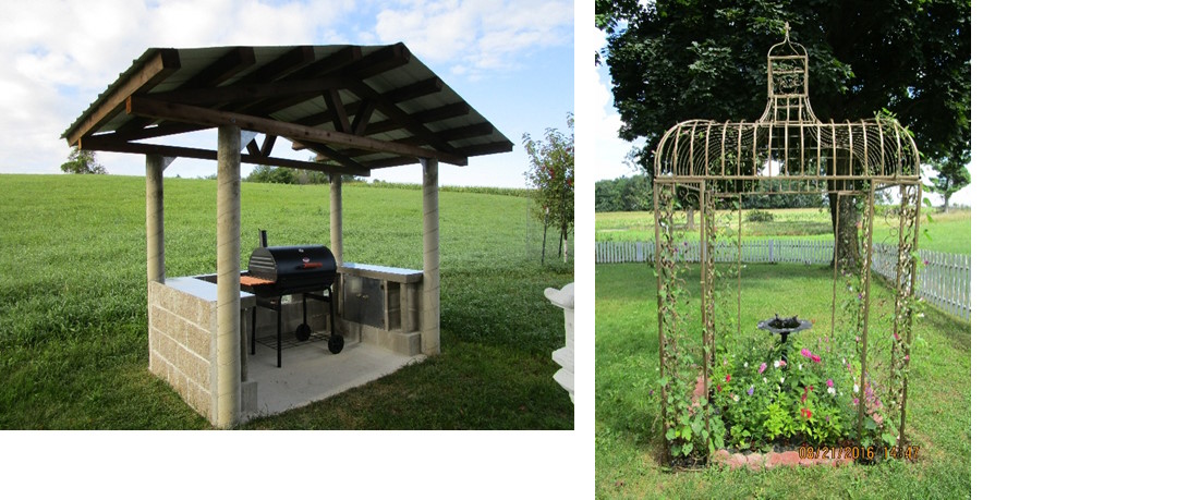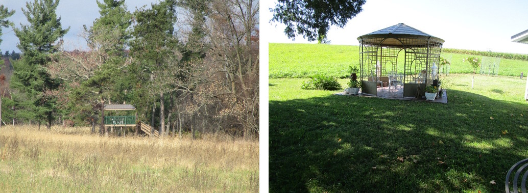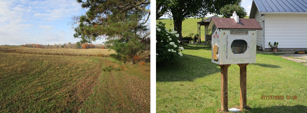 As you look, you will see enjoyable areas you will want to visit for a while on our farm. Next to the house there is a “Free Little Library”, and these books are “free to take home with you.” In the distance is “Pine Tree House,” and out back is the covered Gazebo with lattice sides that looks like a grain bin yet never has been one. The Gazebo is painted in mossy green paint with brown woodgrain highlights that make it easy on the eyes and keep it cool during the times the sun filters through the Maple and Cedar Trees.