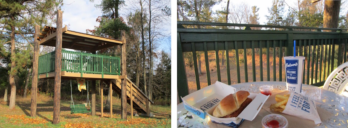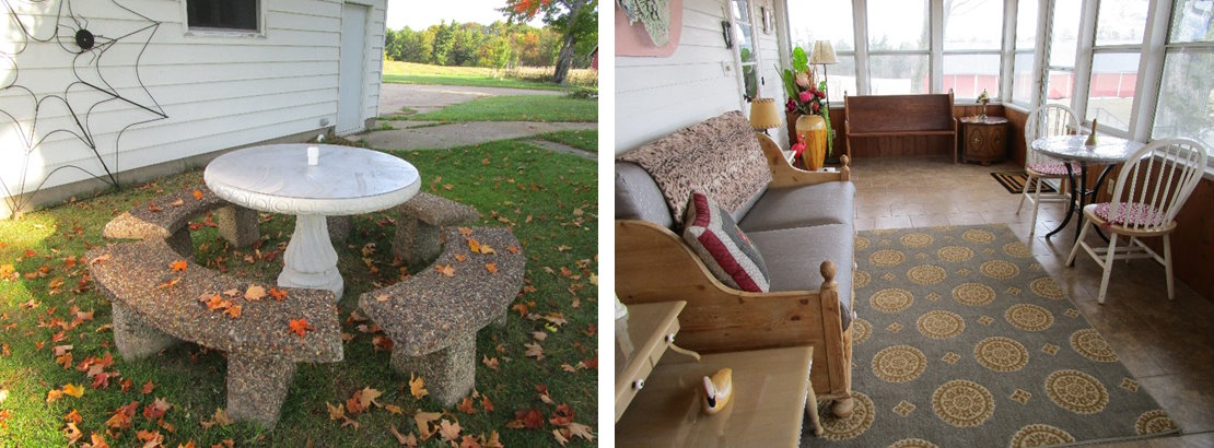 Our guests are welcome to eat inside in their room or lounge if they wish, but they can also take in the beauty of this Central Wisconsin Crop Farm. There is a large octagon shaped Covered Gazebo with large table and near the Gazebo another large round Cement-Picnic-Table right outside the guest entrance in the secluded back yard. And if you feel like a little stroll before Lunch or Supper guests can walk down the field lane to the large out-door Covered-Platform-Patio with Bistro Table and chairs, we lovingly call “Pine Tree House.” Under “Pine Tree House” is a sturdy two-person swing where you can rock and listen to bird songs, the tinkling wind chime and gentle breezes as you swing awhile. At the Tree House you can look over the farm and enjoy a picnic, or you can walk to “Rippling River Park” and have a picnic at the picnic table while you sit by the river and listen to the water.