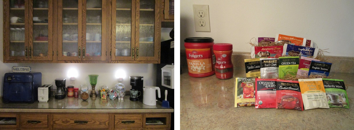 Guests have the use of one full shelf in the refrigerator and half a shelf in the freezer of the Full-Sized Lounge Refrigerator. Guests can bring their own food supplies and make their own sandwiches and microwave their own meals. (There is “no” Guest Stove available.) At various times a guest might find treats waiting for them on the Lounge Buffet Counter.