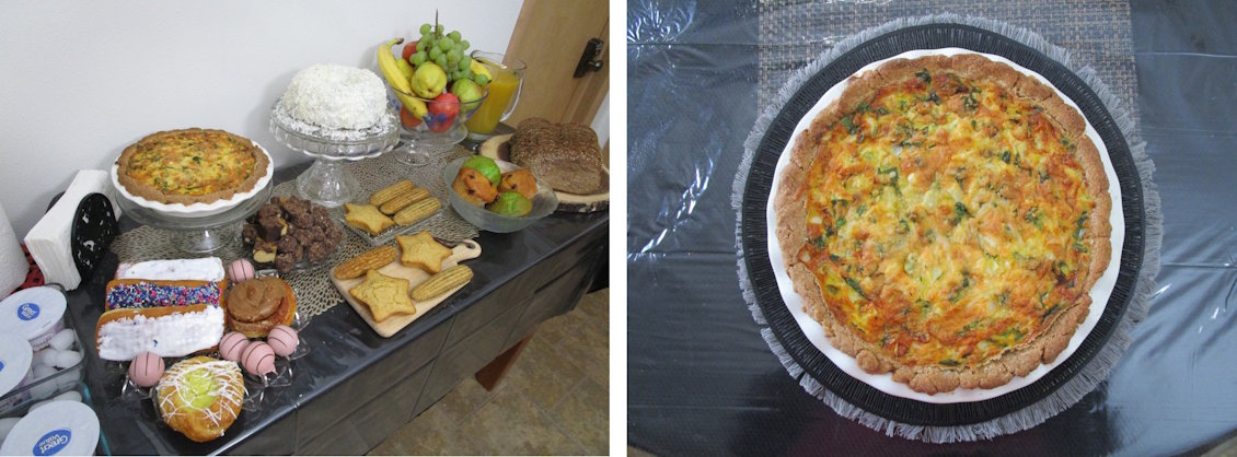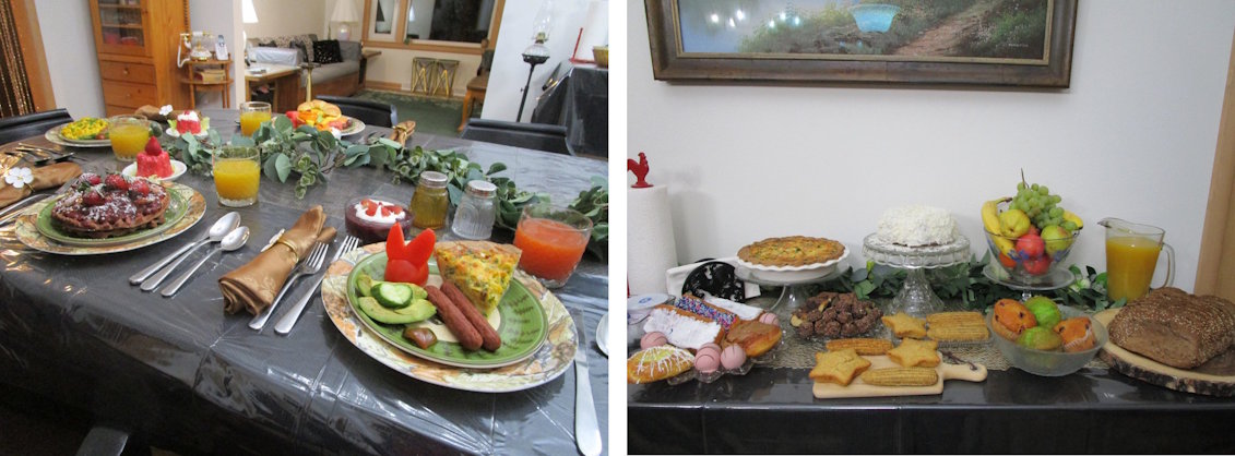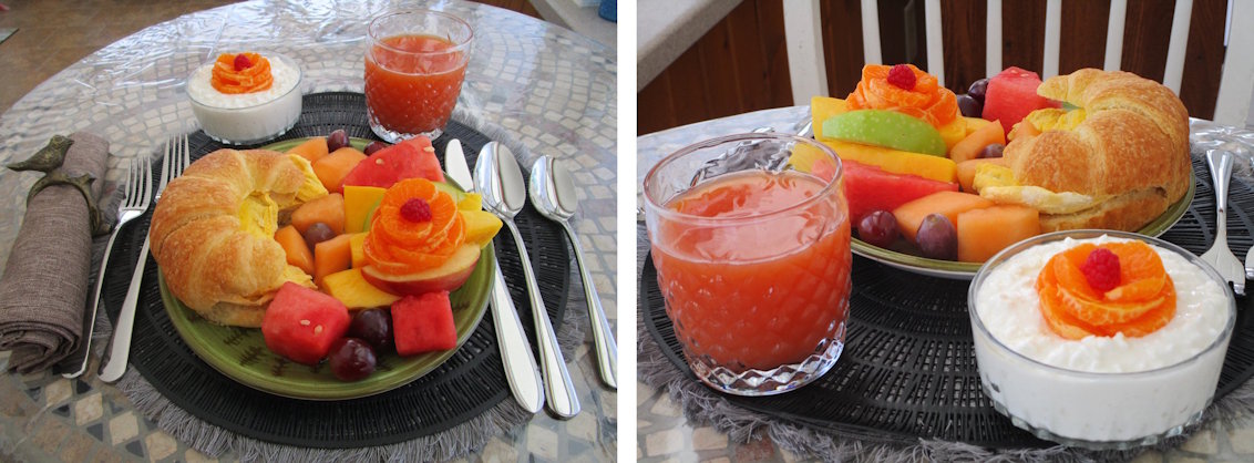 Breakfast consists of a plated main dish, such as a variety of egg dishes with a salad or compote waffle with salad, juice and a buffet table of goodies. Buffet table- will have free choice casserole, breads, muffins, yogurts, fruit and desserts.