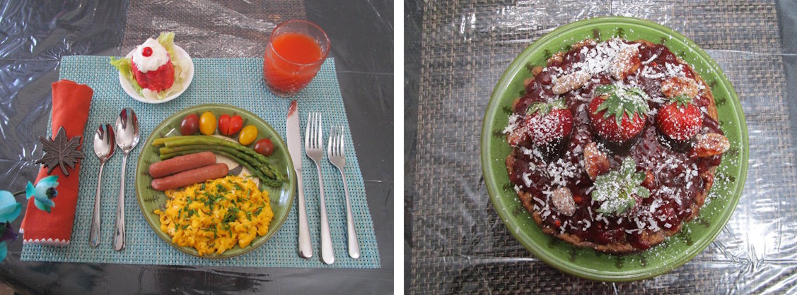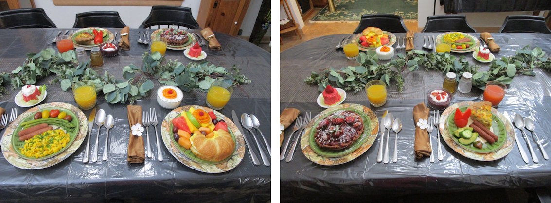 Our food is fresh and often obtained the day of Guest Arrival. While checking in- guests will indicate food allergies and intolerances like needing gluten free food etc. We require guests to fill out menu preferences by 6:00 pm the evening before the next morning’s breakfast.