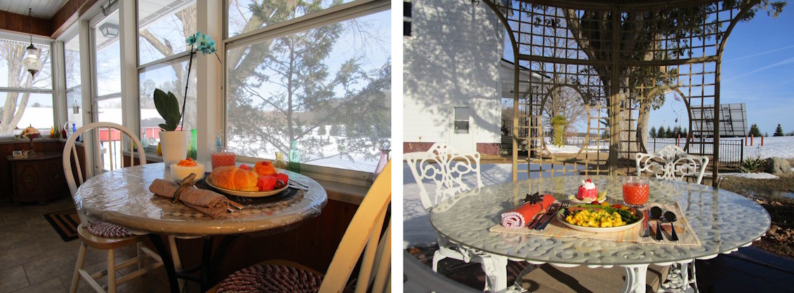 Visitors…be our Guest for Breakfast in our Dining Room…at the time chosen on the Guest Menu. But there are also other choices- as to where you can eat Breakfast- in the Gazebo, at Cement Picnic Table or on the Front Porch.