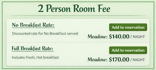 Meadow (Logs & field animals) this ample room with over 200 square feet, contains a queen-sized log bed. The bed and charming animal pictures give the observer the feeling of warmth and attachment to the animals. The room also adjoins its full-sized private bathroom with full sized glass-door shower. A log fireplace (can be run with the heat off), and a bench is stationed at the end of the bed with a simulated tasseled leather pad.